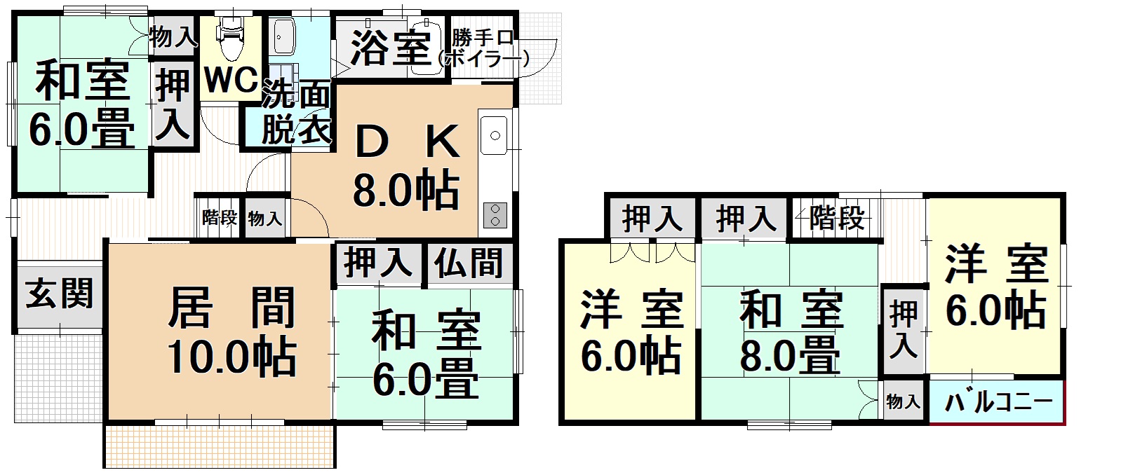 | 間取内訳 | 6DK 1階(和:6.0畳×2/居間:10.0帖/DK:8.0帖) 2階(洋:6.0帖×2/洋:8.0帖) | ||